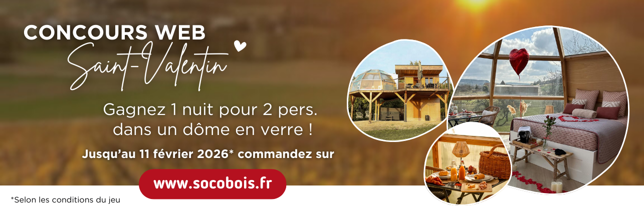 Du jeudi 29 janvier 2026 au mercredi 11 février 2026, pour toute commande passée sur le site www.socobois.fr, supérieure à 500€ HT, vous participez automatiquement à notre jeu concours « Saint-Valentin – Nuit’s féérique en Champagne ». Le gagnant sera tiré au sort parmi les participants.